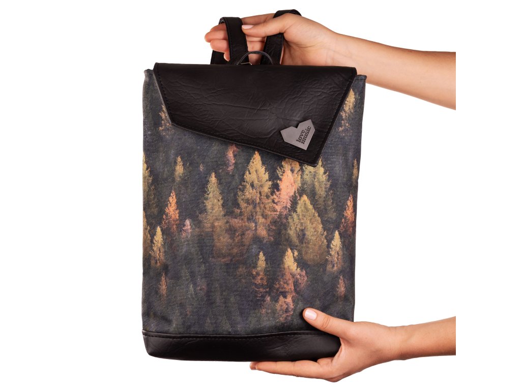 Klopa a spodní část je z odolné koženky, zadní strana z nepromokavé kočárkoviny. Přední díl je ušitý z odolné a nepromokavé polyesterové látky s designovým motivem. Díky tomu batoh dobře drží tvar, odolá dešti i městskému provozu.