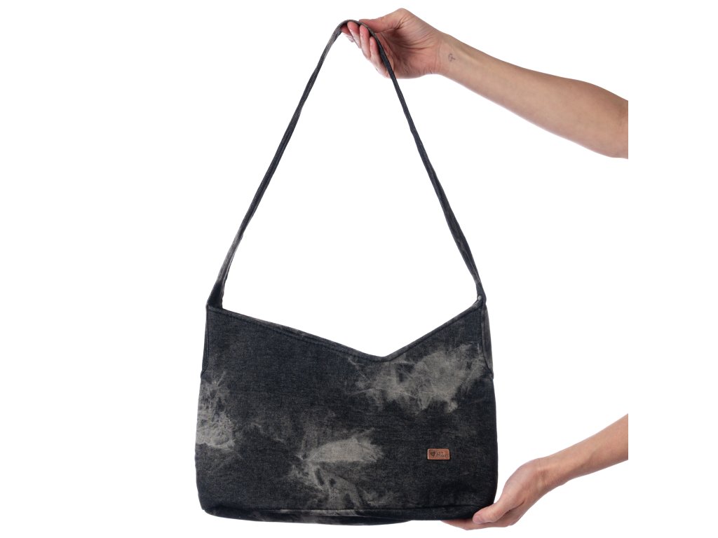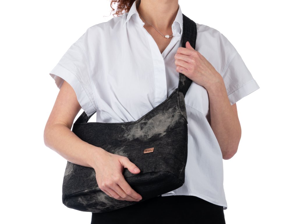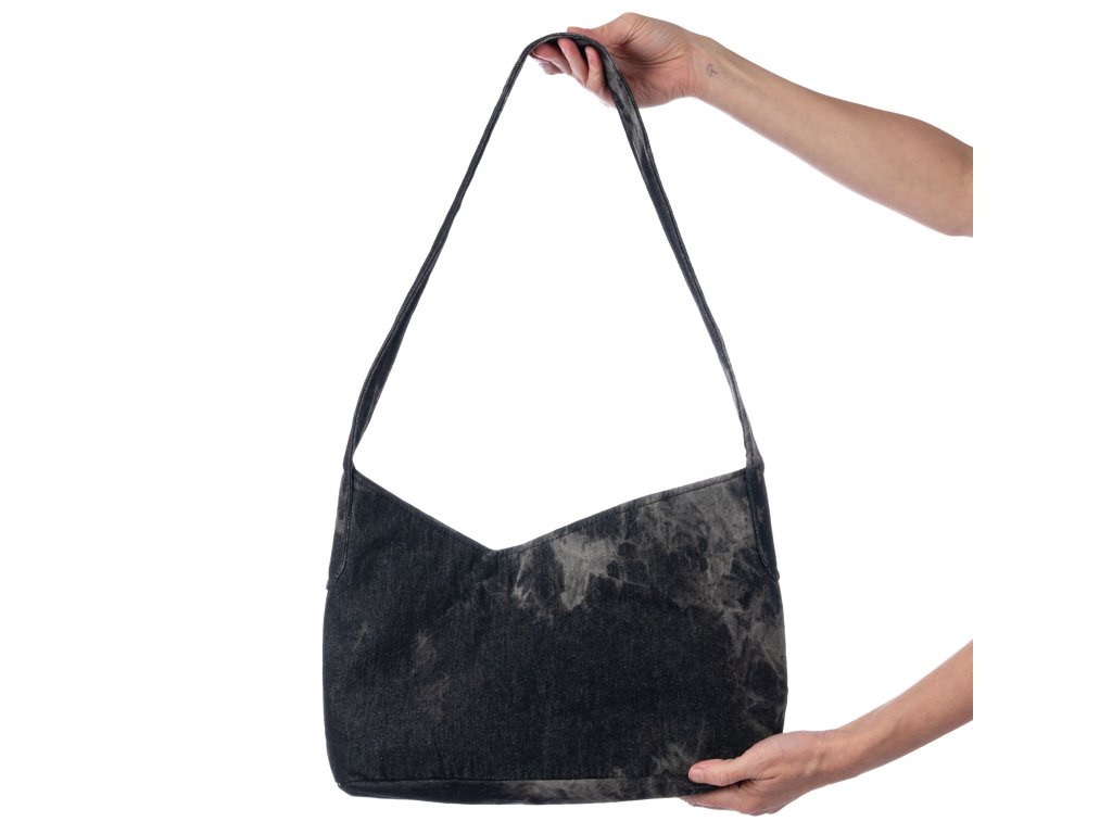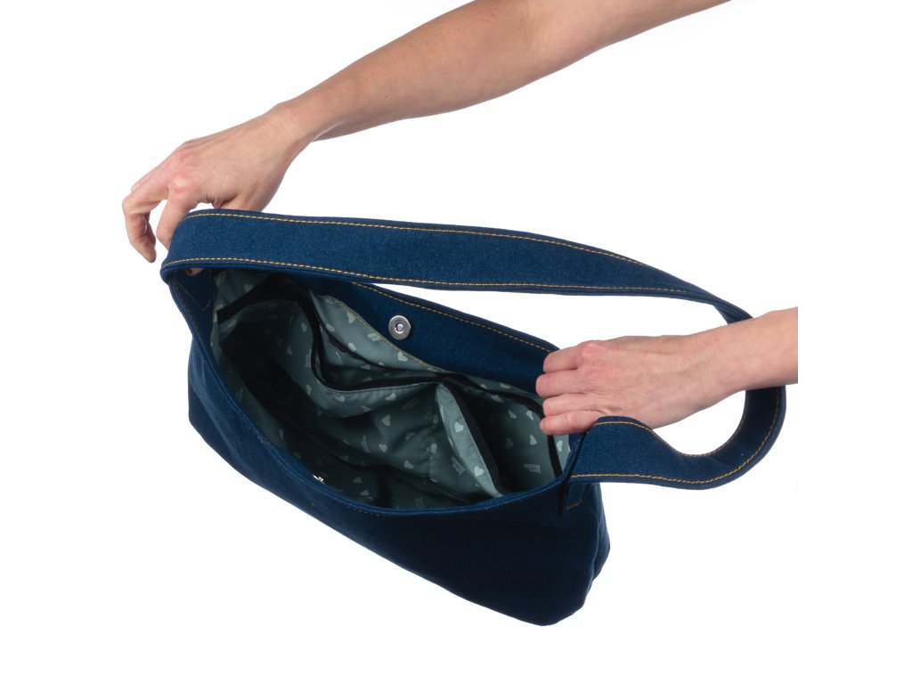 Kabelka se zapíná na magnetické zapínání. Je ušitá ze džínoviny s drobnými třpitivými kamínky. Uvnitř kabelky je naše šedá bavlněná podšívka s Lovemusic srdíčky. Uvnitř kabelky najdete pod zipem dvě menší kapsy, do kterých se vám pohodlně vejde peněženka, mobil i klíče. Můžete ji nosit crossbody nebo jen na rameni.