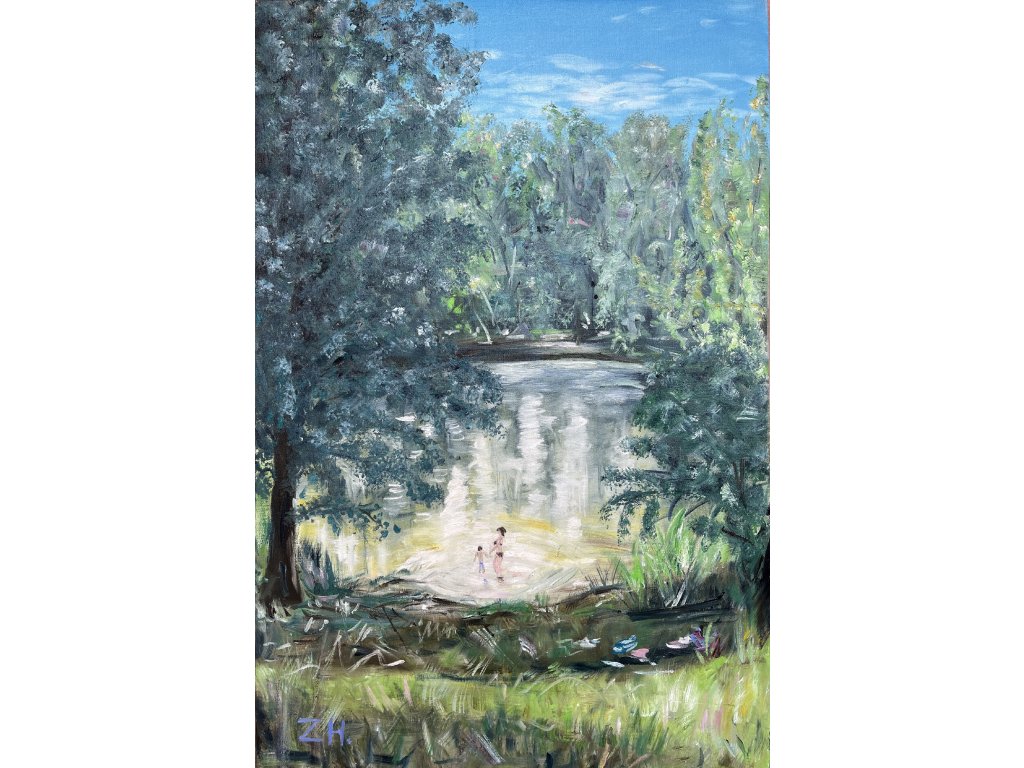 Obraz od Zbyňka, který se jmenuje Idyla Jindřiš. Jindřiš je ves u Jindřichova Hradce, v ní se nachází Pískovna. Tento ranní pohled na maminku s malým klukem ho zastavil jednou ráno, když tam pod širákem nocoval.