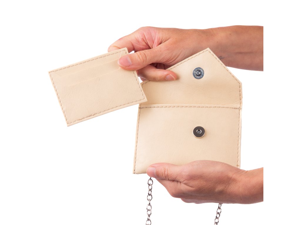 👜 Elegantní kapsička je zavěšená na popruhu z kovového řetízku a uvnitř skrývá praktický karetníček. Můžeš ji používat i jako malou peněženku. Díky řetízku máš doklady i peníze neustále po ruce – a přitom volné dlaně na tanec, drink nebo focení.