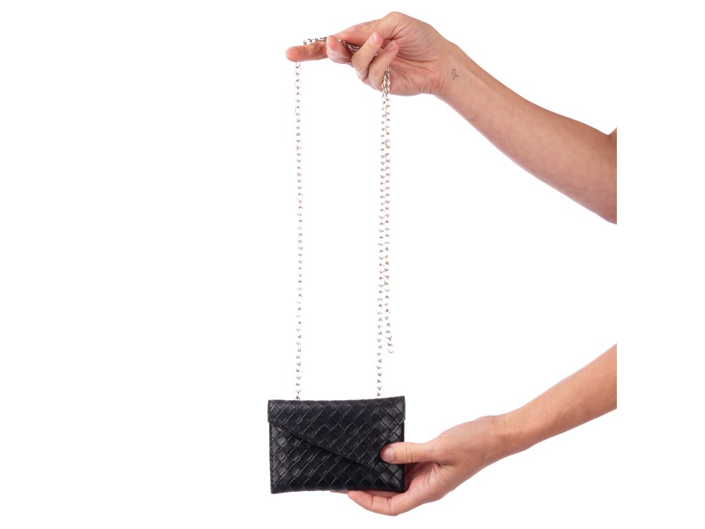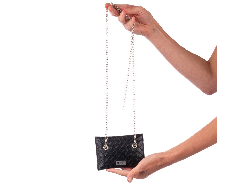 👜 Elegantní kapsička je zavěšená na popruhu z kovového řetízku a uvnitř skrývá praktický karetníček. Můžeš ji používat i jako malou peněženku. Díky řetízku máš doklady i peníze neustále po ruce – a přitom volné dlaně na tanec, drink nebo focení.