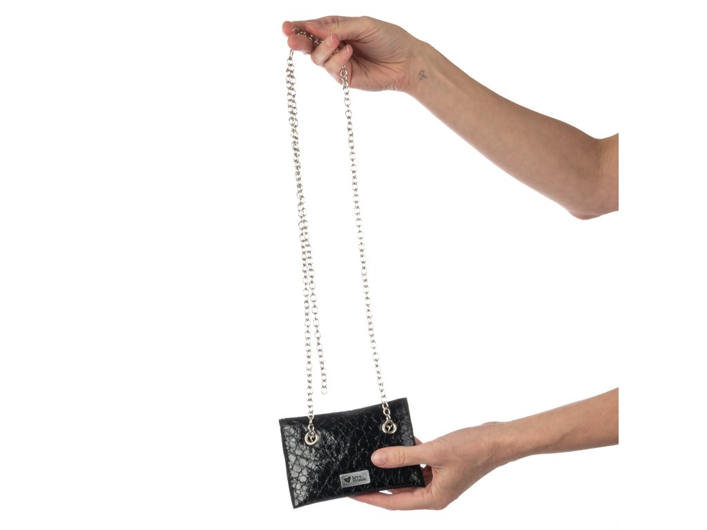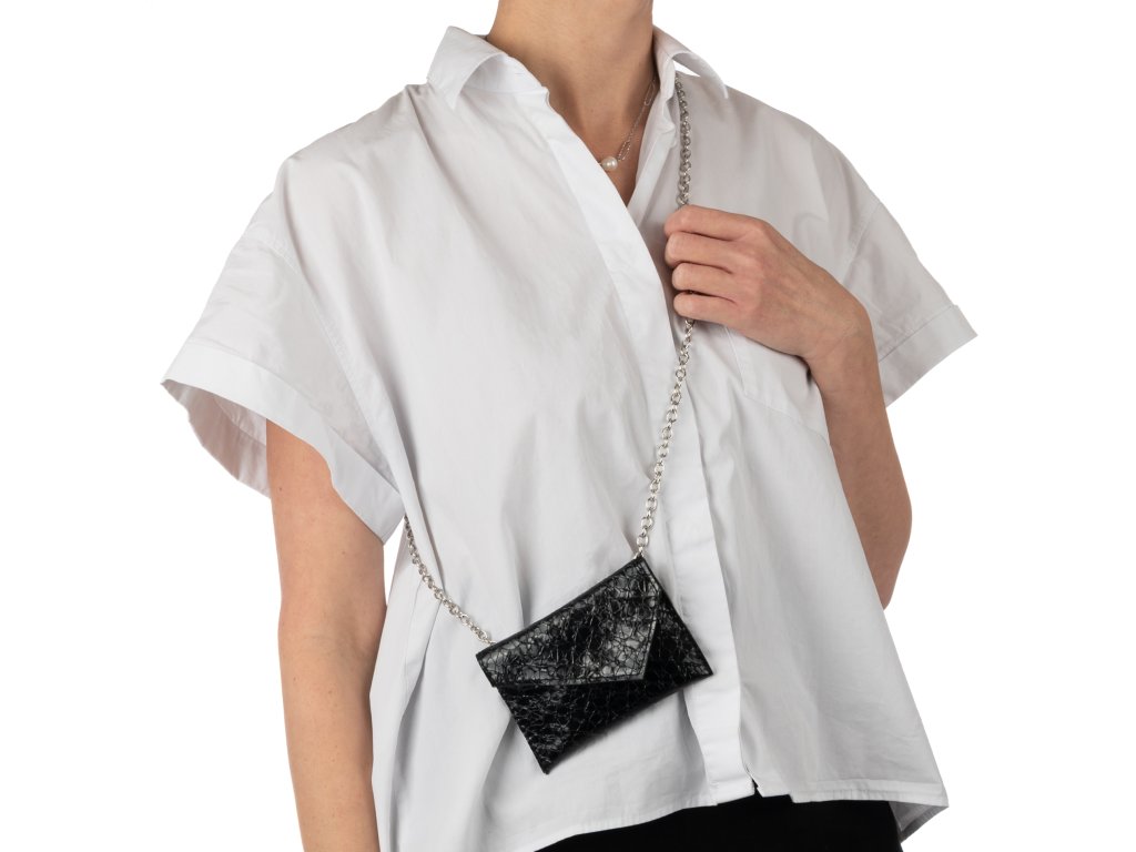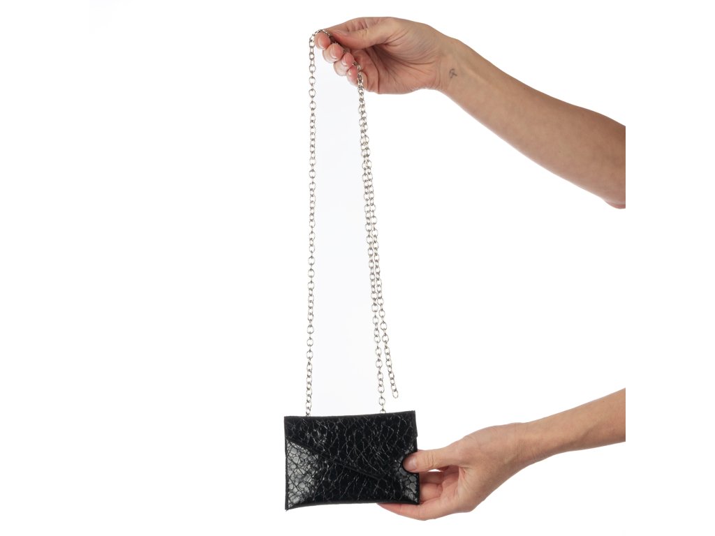 Elegantní kapsička je zavěšená na popruhu z kovového řetízku a uvnitř skrývá praktický karetníček. Můžeš ji používat i jako malou peněženku. Díky řetízku máš doklady i peníze neustále po ruce – a přitom volné dlaně na tanec, drink nebo focení.
