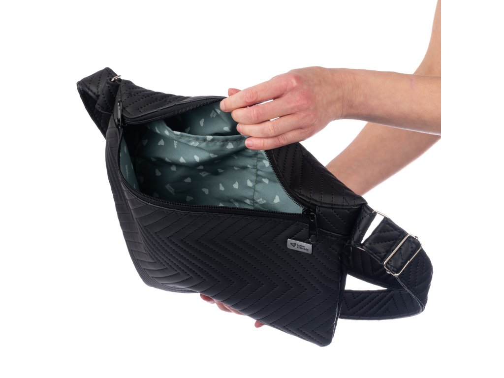 Díky nastavitelnému popruhu a dvěma karabinkám můžeš tuhle praktickou ledvinku nosit crossbody, přes záda nebo kolem pasu – přesně tak, jak ti vyhovuje. Ušili jsme ji z kvalitní veganské koženky, která je lehká, odolná a snadno se čistí. Uvnitř najdeš naši originální bavlněnou podšívku s potiskem Lovemusic srdíček.